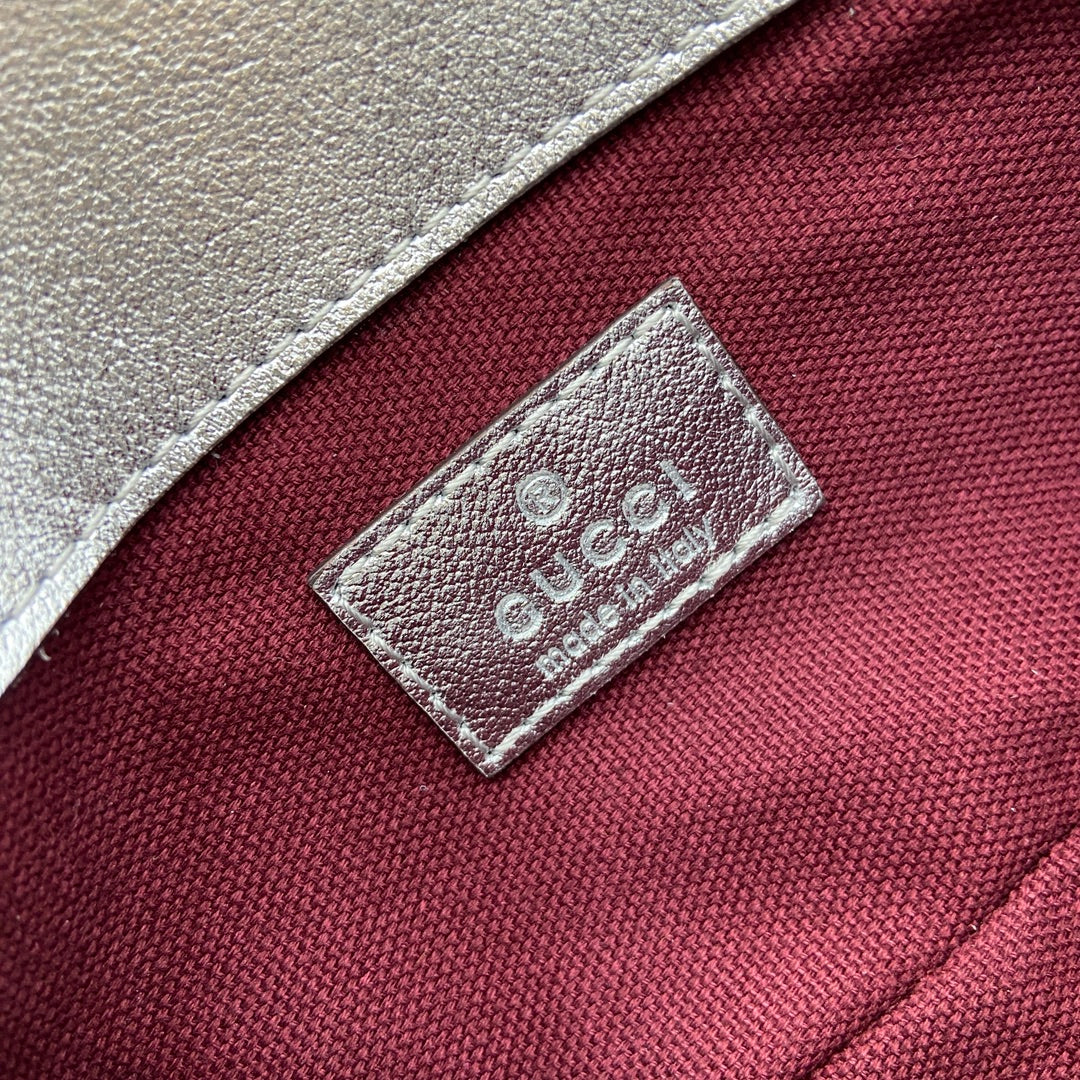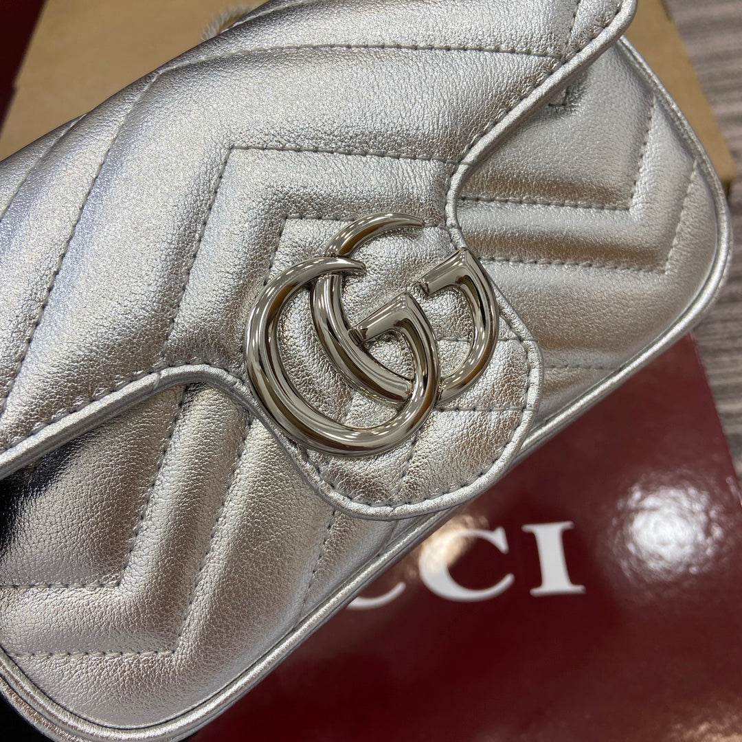 Elevate your accessory game with the Gucci GG Marmont Super Mini Handbag, a luxurious addition to your wardrobe. Crafted from high-quality silver metallic leather, this ultra-mini handbag boasts a unique blend of style and sophistication. Measuring 16.5 cm in length, 10 cm in height, and 4.5 cm in thickness, it's perfectly sized for carrying essentials while making a chic statement.